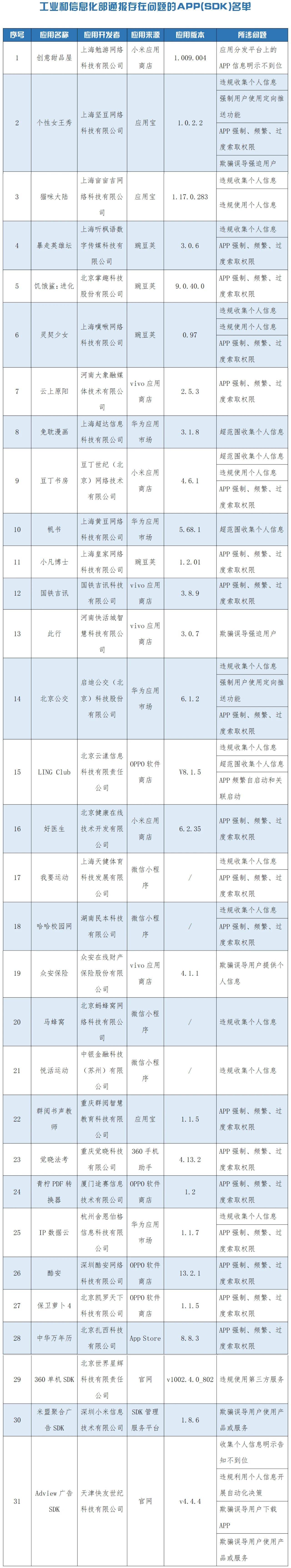 记者7月7日从工业和信息化部获悉,工业和信息化部近期组织第三方检测机构对群众关注的休闲娱乐、实用工具、出行服务等移动互联网应用程序(APP)及第三方软件开发工具包(SDK)进行检查,发现31款APP(SDK)存在侵害用户权益行为,并进行通报。